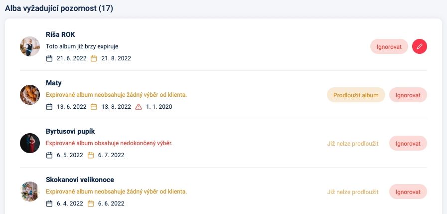 Na úvodní stránce aplikace se zobrazí všechny alba, které by potřebovaly zkontrolovat.